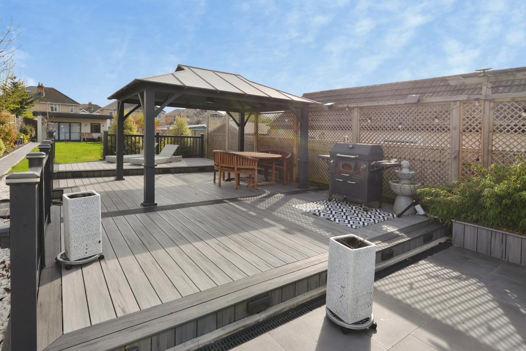 The south-facing rear garden has been professionally landscaped to provide a stylish, low-maintenance outdoor space. Smart lighting, individually controlled and programmable via an app, allows the garden to transition effortlessly from day to evening, creating an ideal setting for entertaining. The space is further enhanced by a generous porcelain patio, a substantial composite decking area, and a sleek aluminum fixed gazebo.