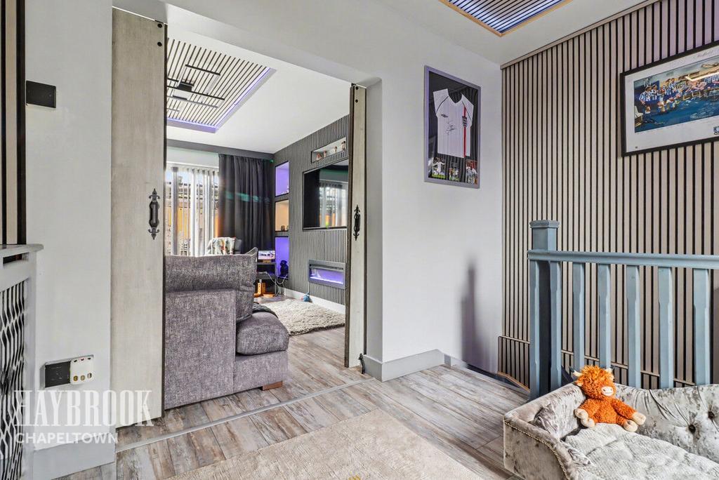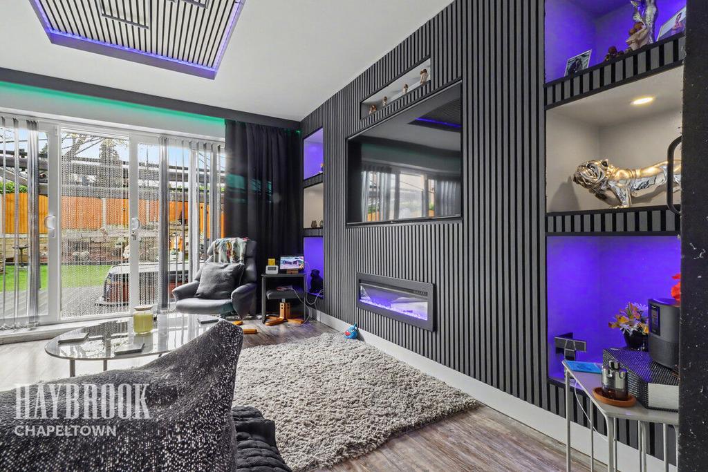 Sliding doors to garden access, media wall, sliding internal doors to snug room.