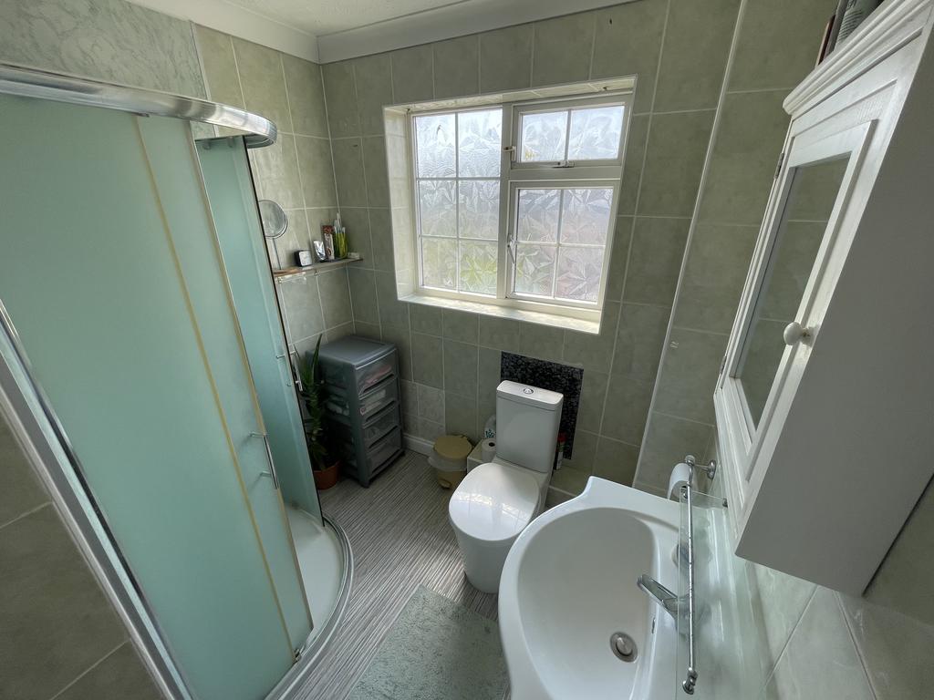 Comprising corner shower cubicle, vanity unit with inset wash hand basin, low-level WC, double glazed window to front, heated towel rail, tiled walls, recessed spot lighting, coved ceiling: