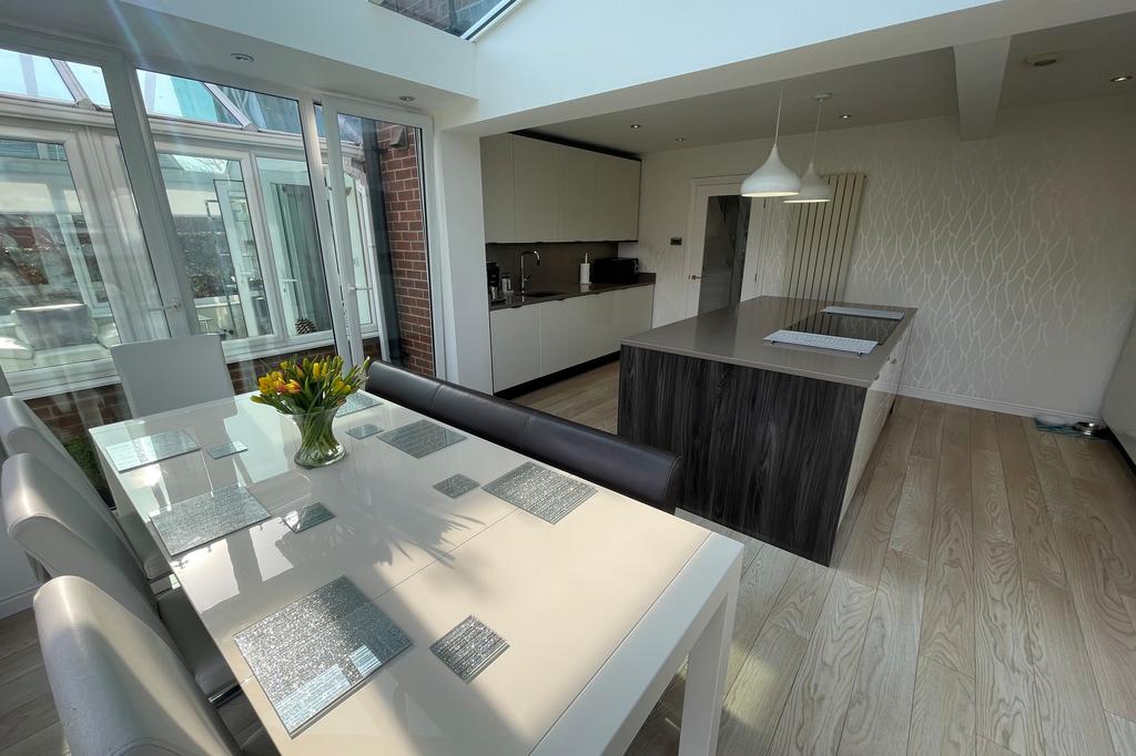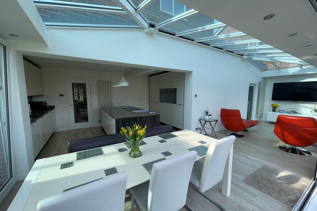 Dining / Family area: uPVC double glazed windows, glass tinted roof, upright double radiator, numerous concealed down lighters and 2 sets of bi-folding doors overlooking and giving access to the rear garden.