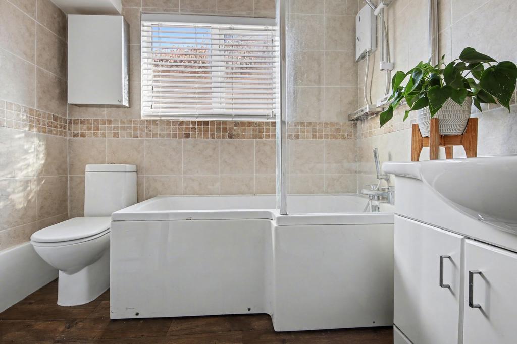 The family bathroom is fully tiled and comprises a WC, wash hand basin with storage, fitted mirror, and a bath with handheld shower. A double-glazed window to the side provides natural light, and there is a heated towel rail.