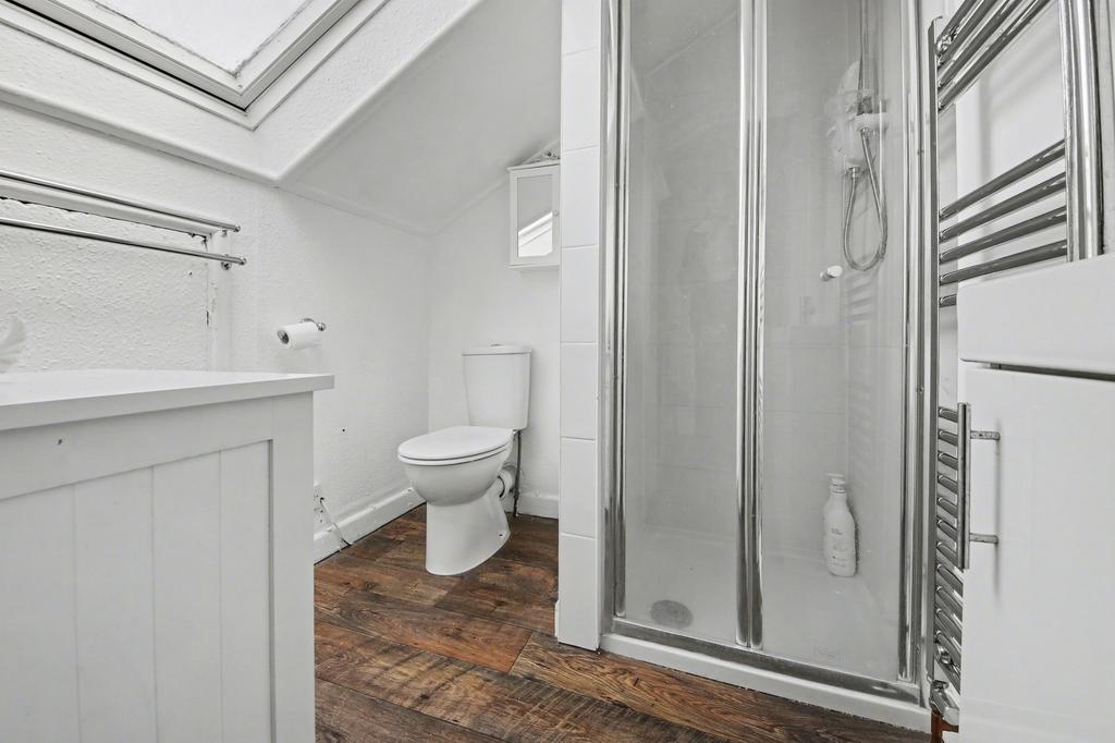The en-suite includes a Velux window, extractor fan, laminate flooring, and tiled walls. It is fitted with a WC, wash hand basin with storage, mirrored vanity unit, shower cubicle, and a heated towel rail.