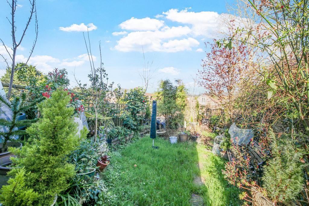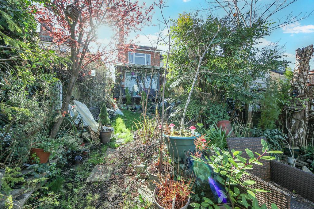 The rear garden is particularly well-appointed, featuring an array of mature shrubs, trees, and flowering plants. It is fully enclosed by fencing, offering privacy, and includes a useful garden shed.