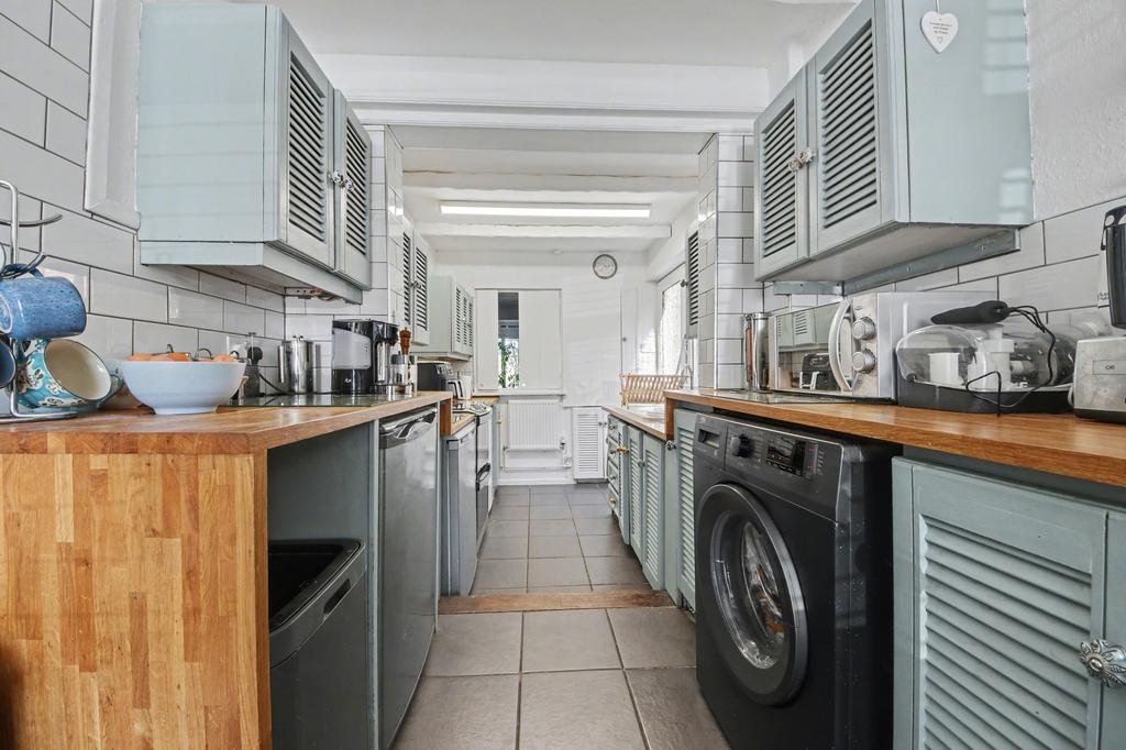 The spacious open-plan kitchen/breakfast room is well-lit by three double-glazed windows—two to the side and a bay window to the front—all fitted with blinds. A double-glazed door provides access to the garden. The kitchen is fitted with a range of wall and base units complemented by solid wood worktops, a sink with drainer, tiled splashbacks, and tiled flooring. There is space for a gas cooker, washing machine, fridge/freezer and a dishwasher with plumbing, along with a breakfast bar and radiator.
