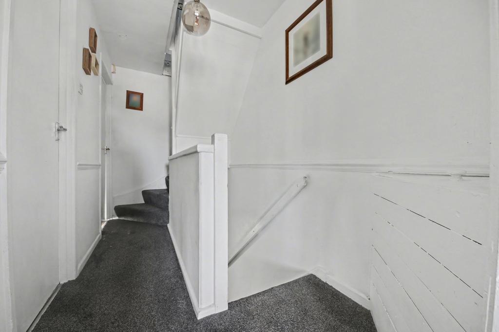 On the first floor, the landing is carpeted and leads to stairs rising to the second floor.