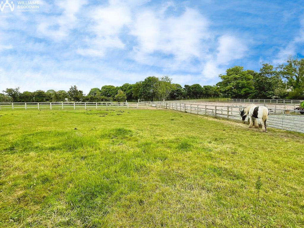 Entered through a large wooden gate which leads to a spacious concrete hard standing area which houses a static caravans with potential rental income whilst offering ample parking for multiple vehicles. There is approx. 6 acres of Smallholding/Equestrian consisting of a stable block which multiple stables, tack/feed room and a hay barn. There are four paddocks of various sizes all with water and field shelters, coupled with a 25m x 40m ménage. There is also a sizeable garage to one side.