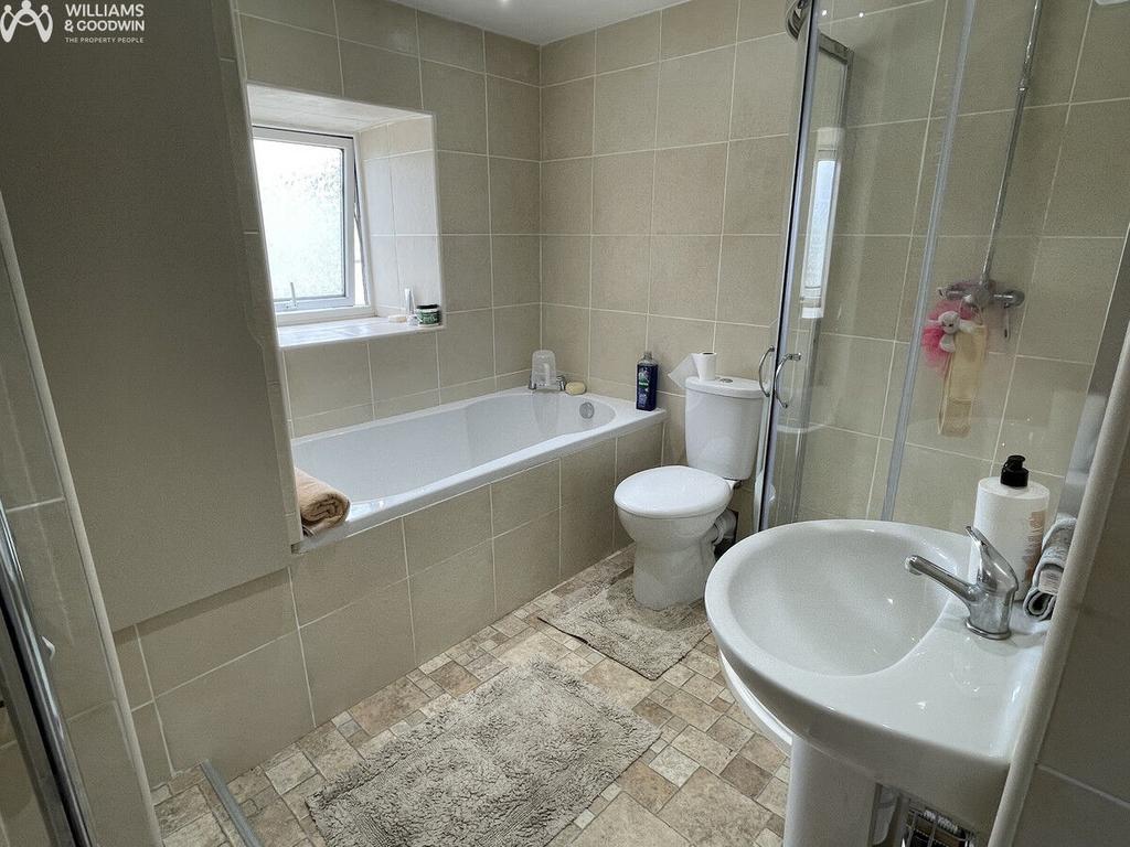 Four piece suite comprising bath, pedestal wash hand basin, shower enclosure and WC with tiled surround, and a heated towel rail.