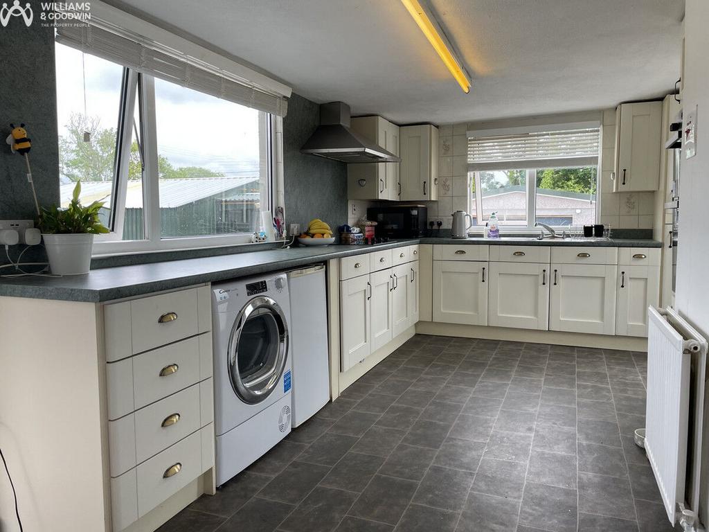 Matching range of base and eye level units with worktop space over, 1+1/2 bowl stainless steel sink unit with single drainer and mixer tap, space for fridge/freezer, fitted electric oven with built-in hob, uPVC double glazed window to side, uPVC double glazed window to front, door to Storage cupboard with shelving, doors to: