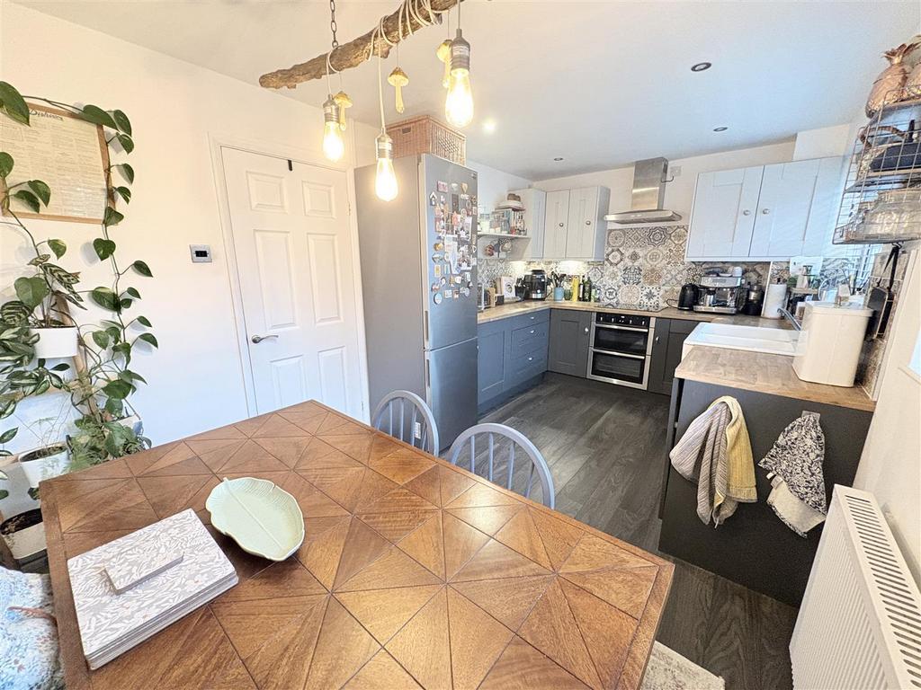 Kitchen/Diner - 4.55 x 2.67 (14'11" x 8'9") - With laminate wood effect flooring, ceiling light point, ceiling spotlights, two double glazed windows to the side aspect, modernised electric radiator, a selection of wall and base units with work surfaces over, built-in washing machine and slimline dishwasher, space for fridge freezer, built-in oven with hob and extractor fan over, tiling to splash backs and two sinks with mixer tap over.