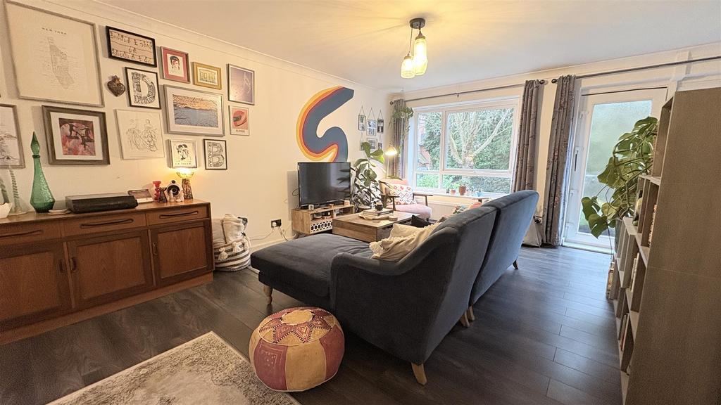 Living Room - 4.02 x 3.67 x 4.57 (13'2" x 12'0" x 14'11") - With wall mounted electric radiator, laminate wood effect flooring, ceiling light point, double glazed window to the front aspect, double glazed French doors giving access to the fire exit area to the front aspect, door opens into kitchen and stairs giving rise to the top floor..