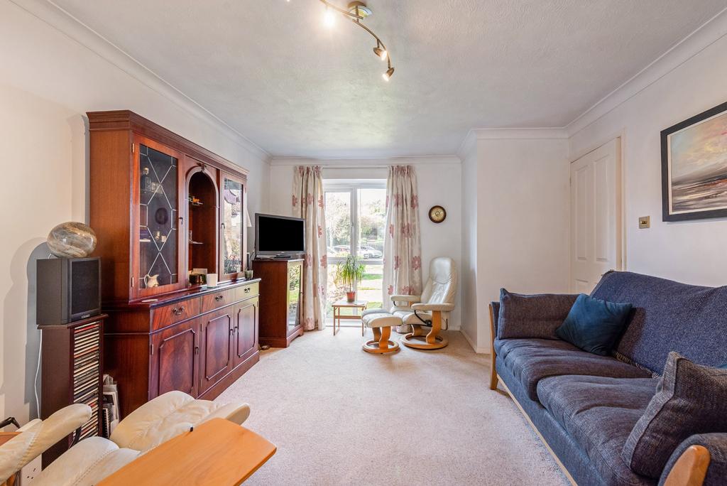 The living area is bright and spacious, featuring a floor-to-ceiling window overlooking the front garden. An open archway connects the living room to the dining area, creating a generous and versatile living space.