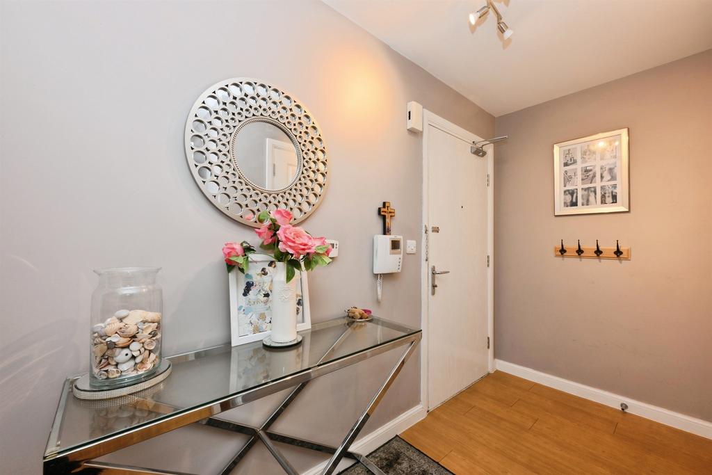 Large storage cupboard, laminate flooring, doors to bedrooms, bathroom and open plan lounge/kitchen.