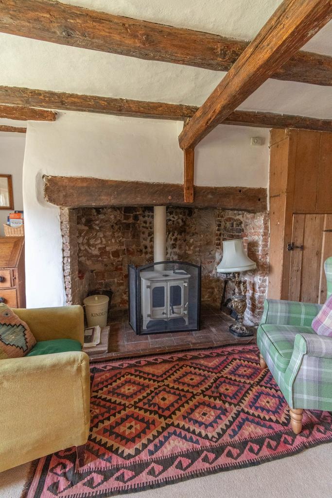 A canopy storm porch and panelled front door with wrought iron furniture lead to the magnificent living/dining room overlooking The Green which is heavily beamed and features a deep inglenook fireplace with wood burner. The separate sitting room is a real bonus, again overlooking The Green and having an exposed brick fireplace. The country kitchen, which leads to the rear courtyard has a lovely rural feel to it and has hand painted shaker style units and pamment tiled flooring .There is a very useful utility room/WC off the kitchen which is handy for muddy boots or muddy dogs or children when returning from long country walks.