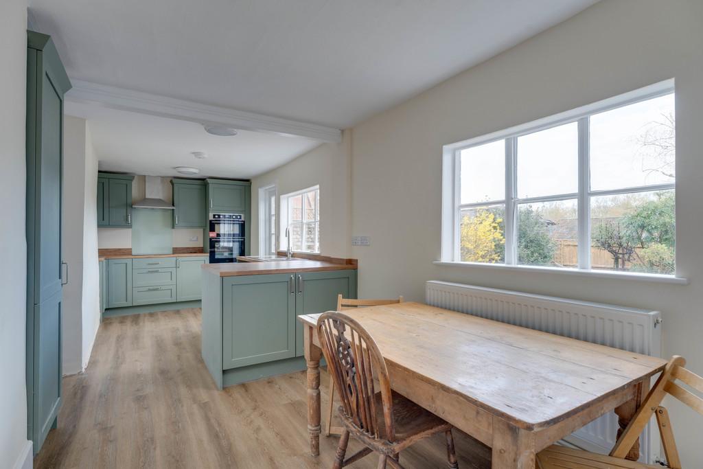 INTERIOR Entrance into a generous HALLWAY with quarry tiled flooring, exposed brickwork and beams. Doors to DRAWING ROOM a generous reception room with four sliding sash windows to the front aspect, an insulated adjoining wall, exposed beams and door to the KITCHEN/BREAKFAST ROOM newly fitted with a range of wall and base units under worktop. Integrated appliances include an electric oven, microwave oven, four ring induction hob with extractor over and fridge/freezer whilst there is space and plumbing for a washing machine or dishwasher. Plenty of space for a breakfast table and chairs. Outlook to the rear and door leading to the rear terrace. An INNER HALLWAY provides access to the UTILITY ROOM with space and plumbing for a washing machine and tumble dryer and SHOWER ROOM comprising tiled shower cubicle, pedestal sink unit unit, WC, heated towel rail and part-tiled walls and flooring. Also providing access to the first floor. To the rear of the property there is a generous two-tiered open-plan vaulted reception space, currently segregated into a DINING AREA with hard flooring and door leading outside. Oak spindles and staircase lead down to a generous SITTING ROOM with a vaulted ceiling and views across the garden.