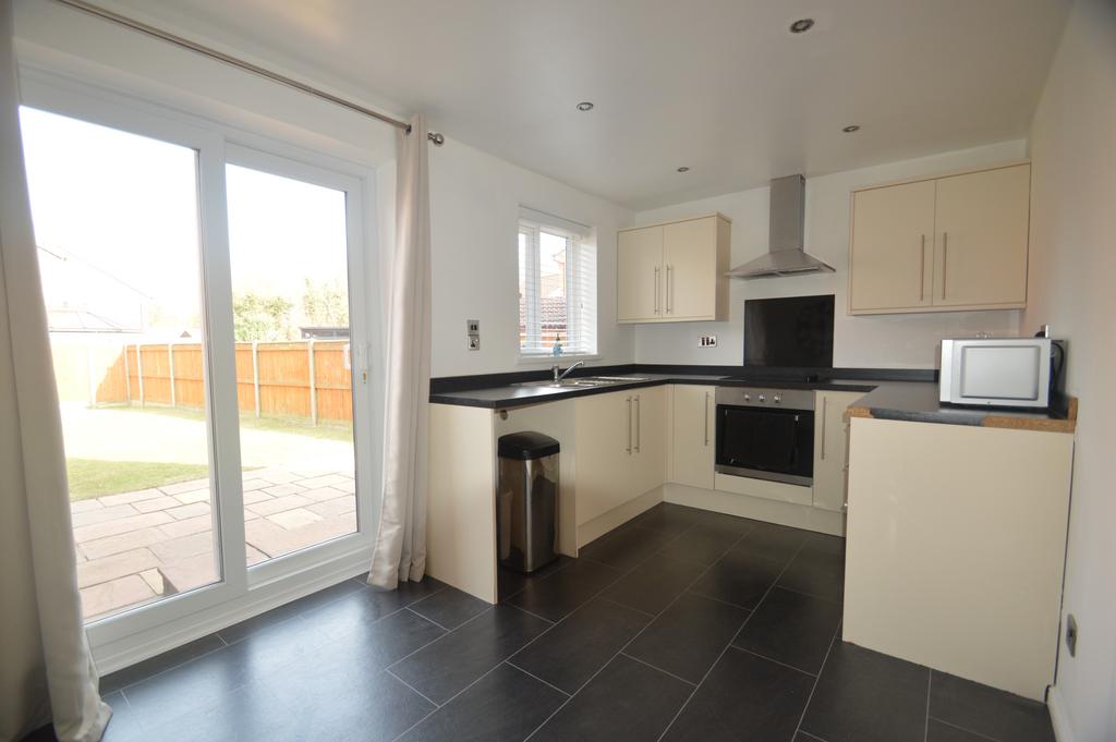 Stylish open plan kitchen diner space with a fully function kitchen with built in hob and oven. Kitchen is finished in white gloss. Patio doors leading to the rear garden.