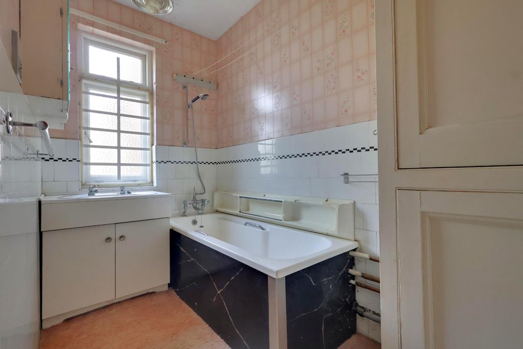 Panelled bath with shower attachment. Ceramic sink with cupboard under. Airing cupboard.