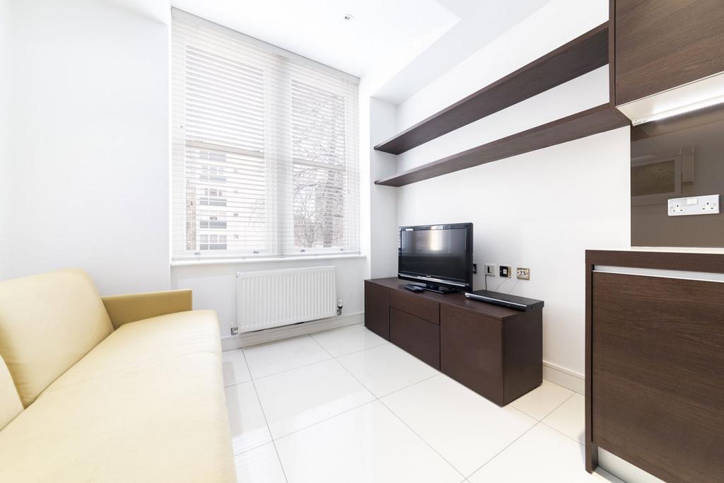A recently refurbished studio with high-quality interiors and bespoke fixtures, featuring a smart combined living and sleeping area.