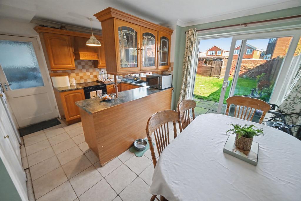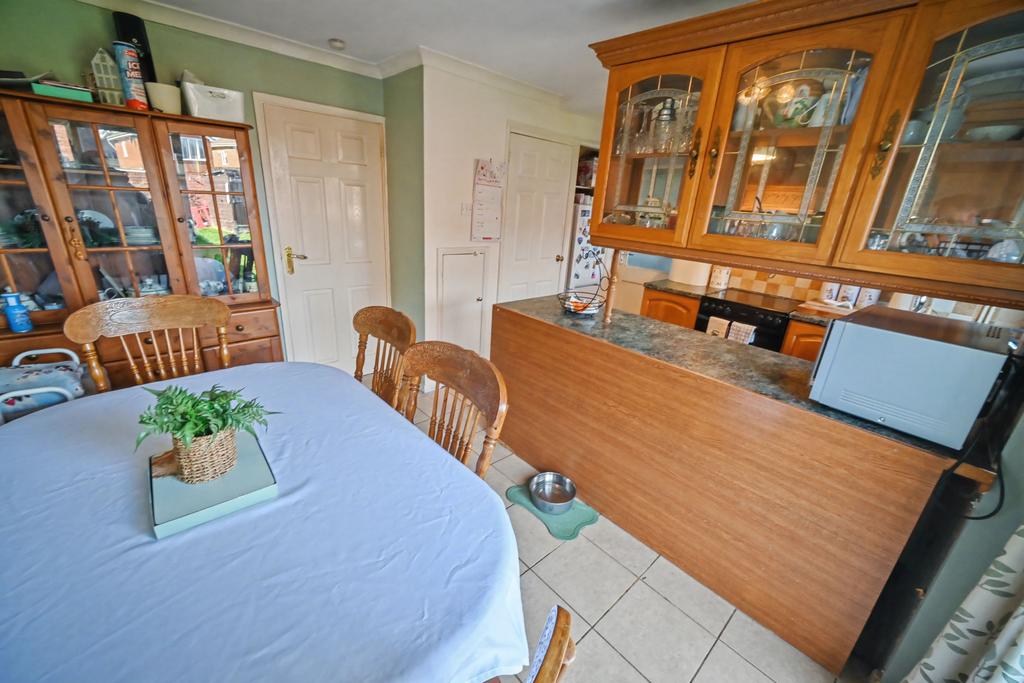Open Plan Dining Kitchen: 12’1’’ max (3.69m max) x 15ft (4.57m) Fitted with a traditional suite of matching units comprising a range of base cupboards, drawers & coved suspended wall cupboards, laminate worktops with 1½ drainer sink unit, recess & gas point for cooker with extractor hood over, recess for fridge freezer, built in pantry and additional storage cupboard, radiator, coved ceiling, tiled flooring double glazed windows to rear and matching patio door.