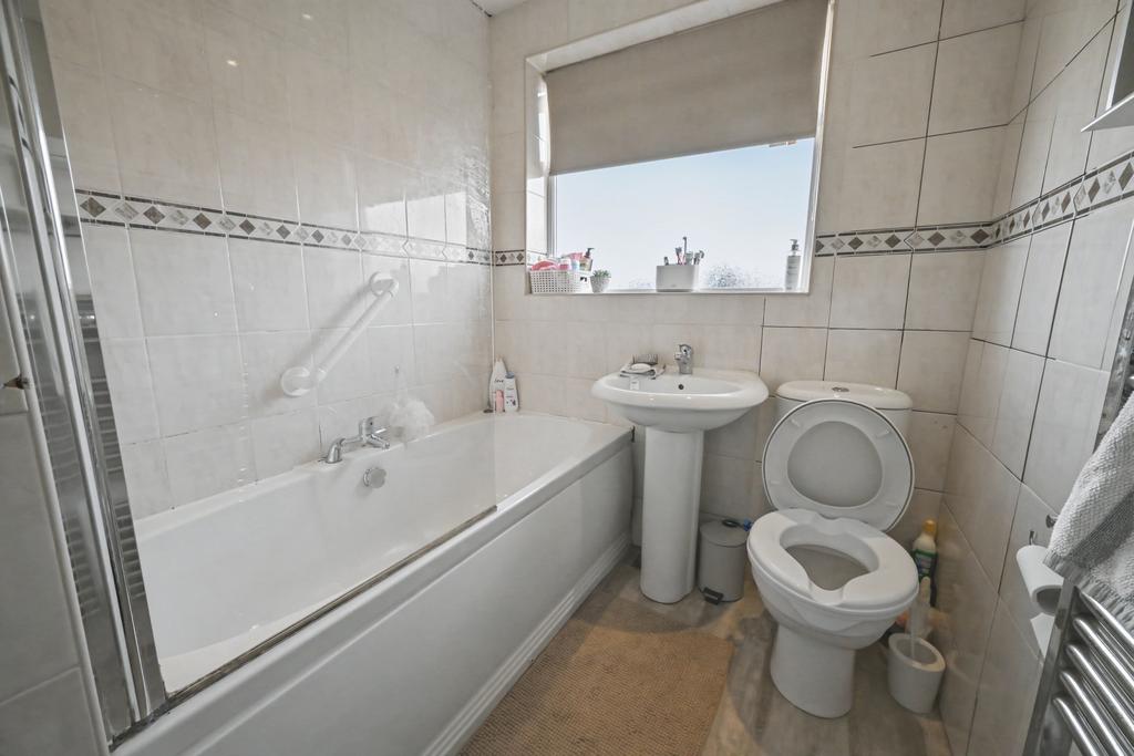 Bathroom: 6’10’’ (2.09m) x 6ft (1.82m) Fitted with a white suite comprising panelled bath with shower unit & side screen, pedestal wash hand basin, low level WC, chrome heated towel rail, tiled walls, recessed ceiling spotlights, laminate effect vinyl flooring, double glazed opaque window to rear and built in airing cupboard housing wall mounted gas fired central heating boiler.