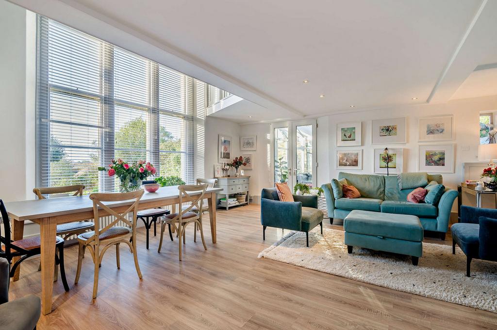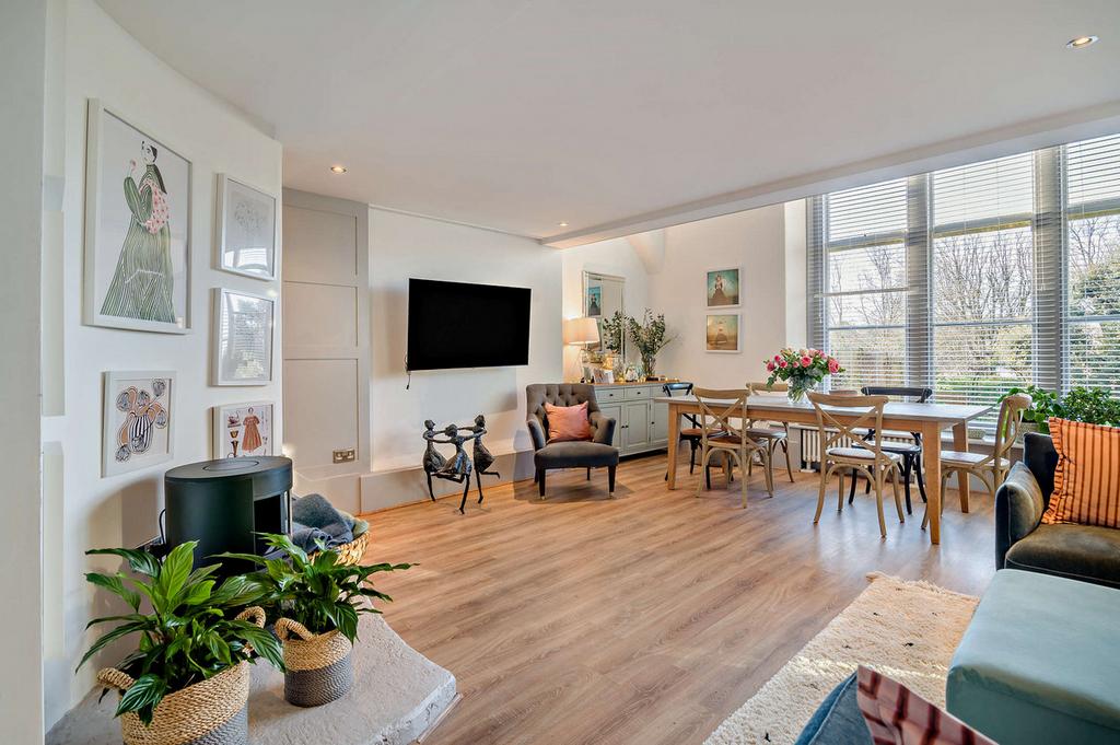 Inside, the heart of the home is the impressive sitting and dining room, a beautifully proportioned and sociable space, flooded with natural light from striking double-height windows and offering a warm, inviting atmosphere. Whether hosting friends, relaxing with family or enjoying quiet evenings in, this room adapts beautifully, with character features adding depth and personality without overwhelming the clean, contemporary styling.