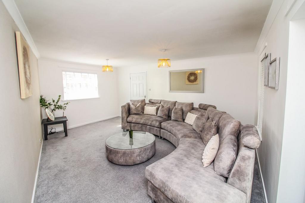 A large lounge with beautiful neutral décor, carpet flooring and double-aspect windows. There are also glazed French doors giving access to the conservatory.