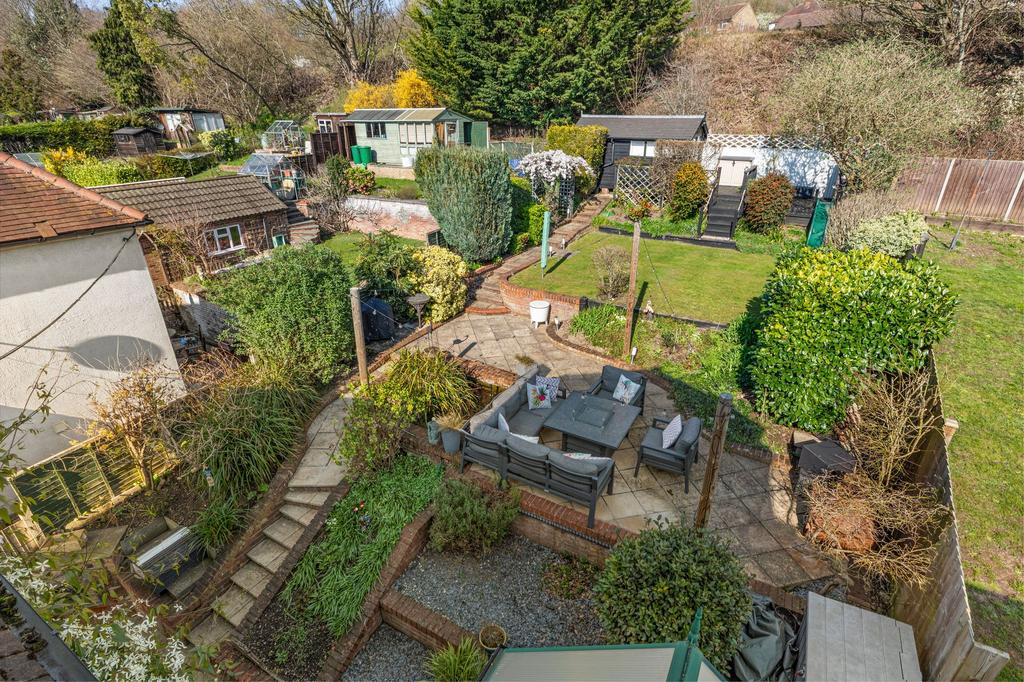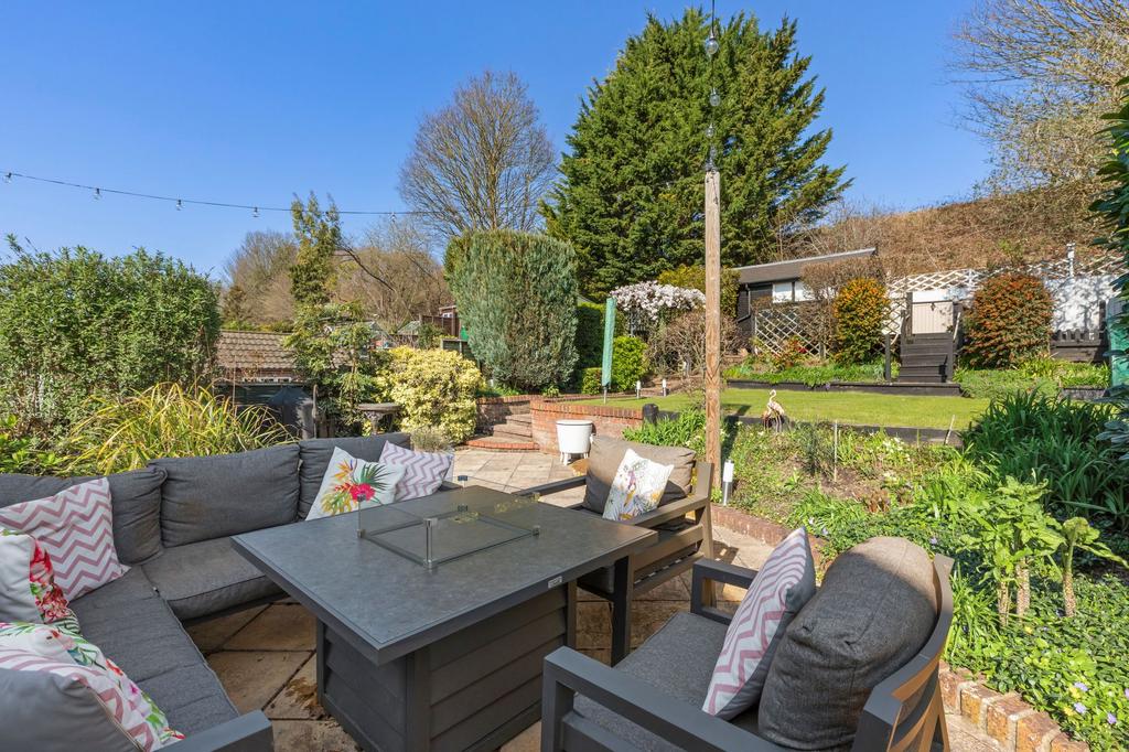 Outside, the landscaped rear garden is made for enjoying, multiple patios, mature borders, a built-in brick pizza oven and a fully equipped garden office with light, power, water and insulation. A driveway for three or more cars and storage can be found to the front.