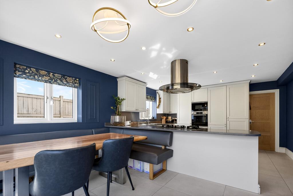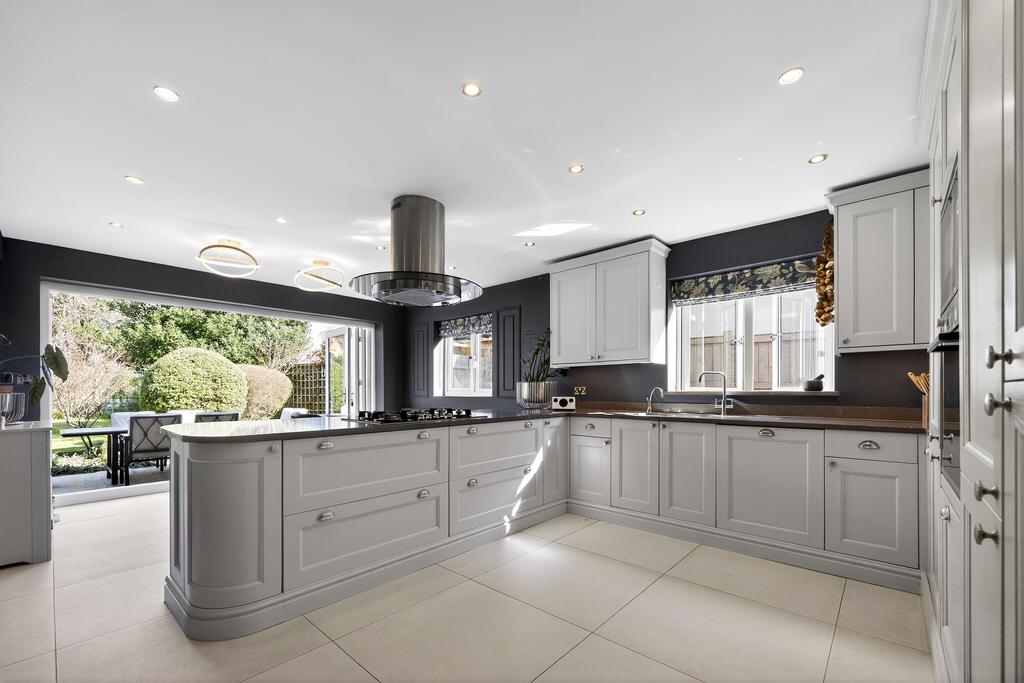 To the right-hand side, the property boasts a generous country-style kitchen fitted with a range of units and integrated appliances. An adjoining utility room adds further practicality. The kitchen flows effortlessly into the dining area, where additional bi-fold doors open onto the garden, making this an ideal space for entertaining and family gatherings.