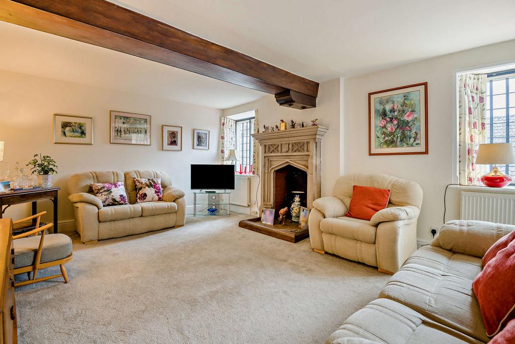 From the entrance hall, a staircase rises to what is currently arranged as a generous first-floor living room. Here, a grand open fireplace forms the centrepiece, while windows frame views across the courtyard. Adjacent lies the family bathroom. This flexible level could equally serve as a spacious third bedroom if preferred, allowing the home to be enjoyed as either two bedrooms with two living areas or three bedrooms with a single reception space.