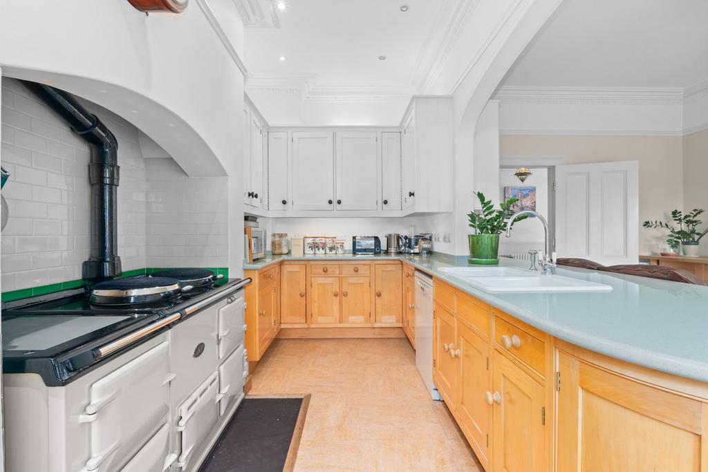 The heart of the home is the open plan kitchen/family room, which looks over the rear garden and is flooded in natural light from the large sash windows with working shutters, further features include a working marble fireplace and access to the beautiful rear garden. The kitchen has ample wall and floor units with a large central worktop island and integrated appliances to include an Aga.