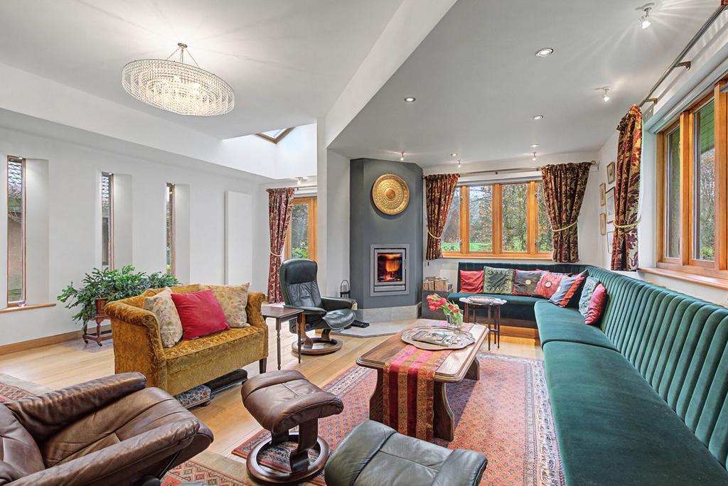 The garden room is a particularly striking feature of the house, filled with natural light from extensive glazing and roof-light. Centered around a contemporary fireplace, it offers a generous and versatile reception space with views across the gardens and a strong connection to the outdoors throughout the year.