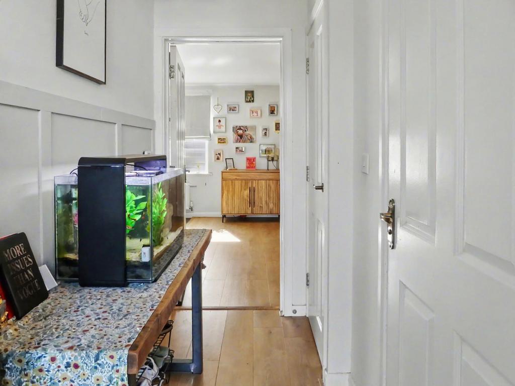 Entrance hall: Useful store cupboard. Thermostat for heating. Door to open-plan living/kitchen/diner.