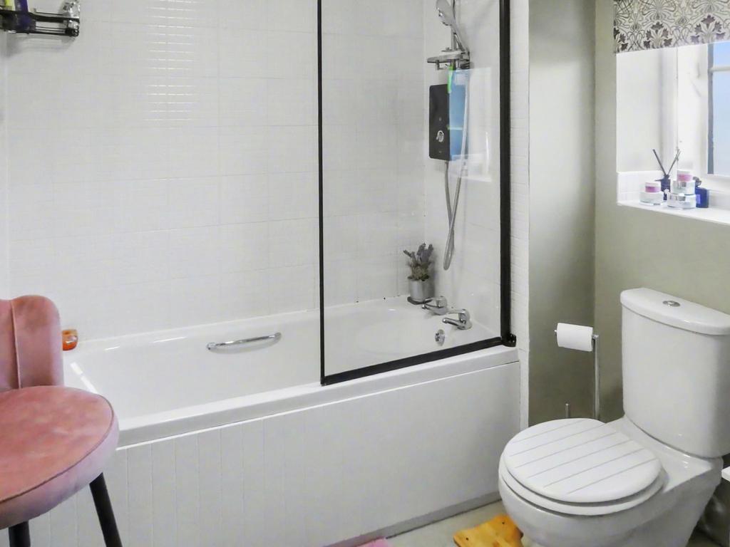 Bathroom: Contemporary white suite comprising of panel bath with shower unit over, pedestal handbasin and low level WC. Heated towel rail. Tiling to splashback areas. Useful storage cupboard. Extractor. Double glazed window to front. Shaver socket.