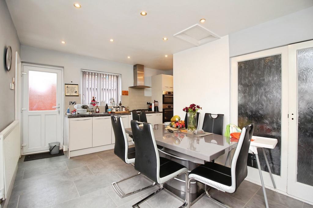 A particular selling feature of the home is the extended open-plan kitchen diner, fitted with a modern range of high-gloss cabinets with soft-closing drawers. The kitchen includes a built-in oven and grill, four-ring hob with extractor hood, sink and drainer, integrated dishwasher, and space for two additional appliances. There is plenty of room for a table and chairs, along with a side access door and French doors that open out to the garden.