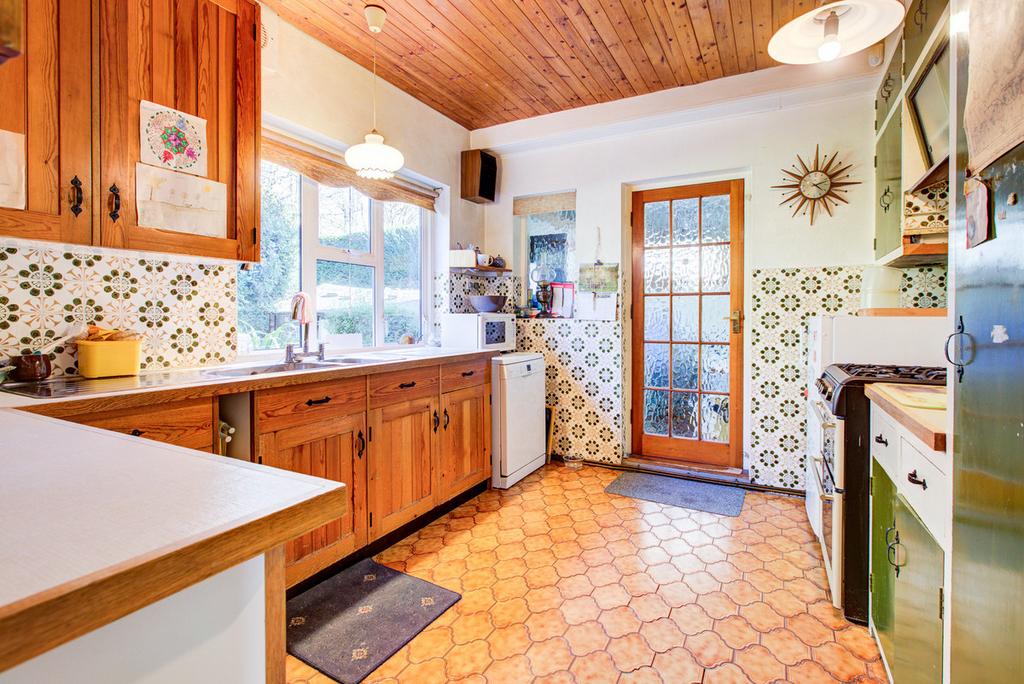 Large window to rear overlooking garden. Kitchen comprises of a range of base and eye level units. 1 and a half sink and drainer unit, oven, fridge and dishwasher (none fitted), ceiling light, tiled flooring, wooden ceiling.