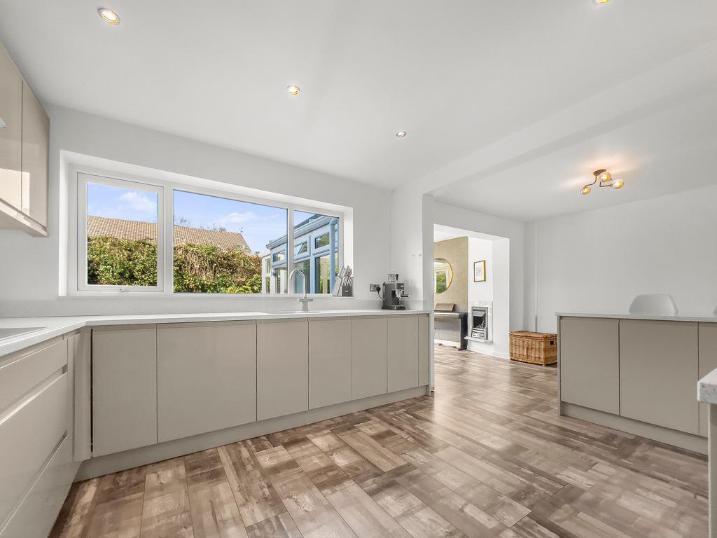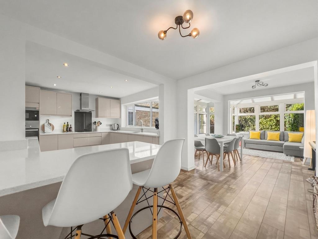 To the rear, the property really comes into its own. The extension has created a sociable, open-plan layout that flows effortlessly from one space to the next. The kitchen/breakfast area is both stylish and practical, featuring sleek cabinetry and a breakfast bar, perfect for everyday living. This leads into a further sitting area and continues through to a bright conservatory overlooking the garden, offering a light-filled space that works brilliantly for entertaining or family time.