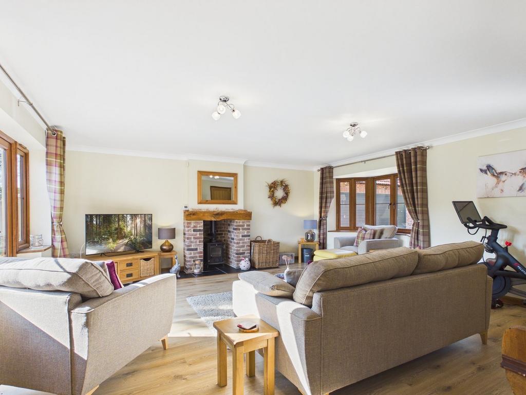 19' 4" x 17' 6" (5.89m x 5.33m) UPVC double glazed patio doors to rear. UPVC double glazed bay window to front. Log burning stove within brick surround with oak mantle. Laminate floor.