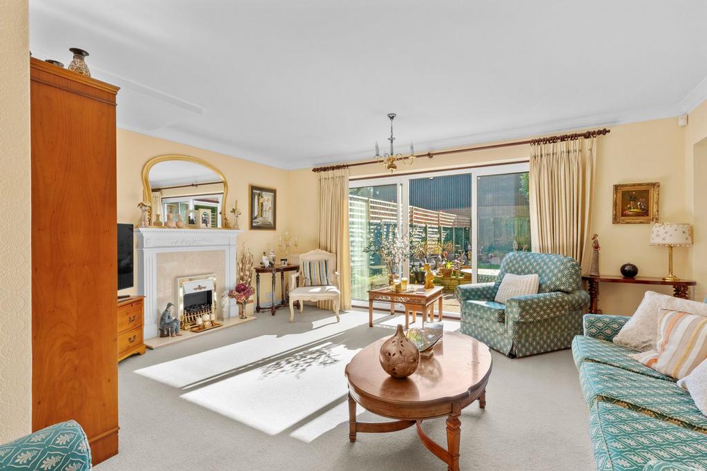 Fireplcae with fitted electric fire, two radiators, sliding patio doors to garden, door to lobby