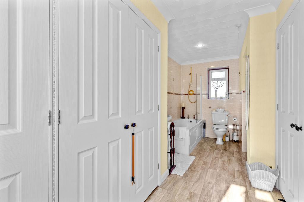 White suite comprising panelled bath, low level W.C., wash hand basin, down lighters, tiled walls, radiator, airing cupboard housing foam clad hot water cylinder and shelved storage, window to front