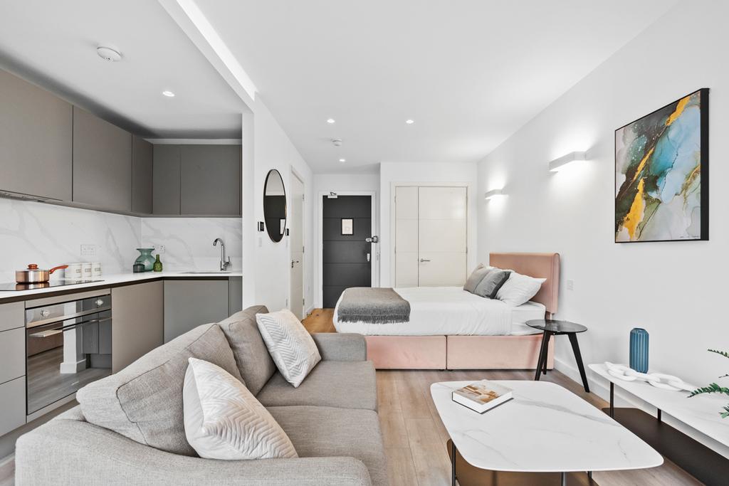 Discover this stylish studio flat at Akron House, part of Vonder Skies in Brentford. This fully furnished studio boasts sleek kitchen with modern appliances, private sleeping area and a bright bathroom. Designed with functionality in mind, the flat features large windows, wooden flooring with underfloor heating, and a secure video entry system.