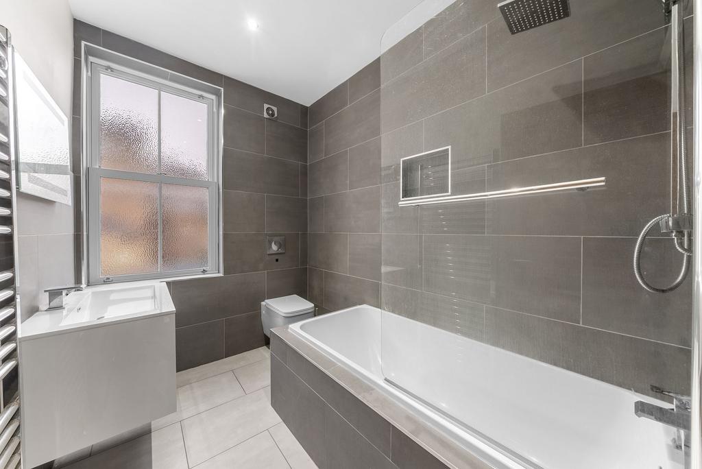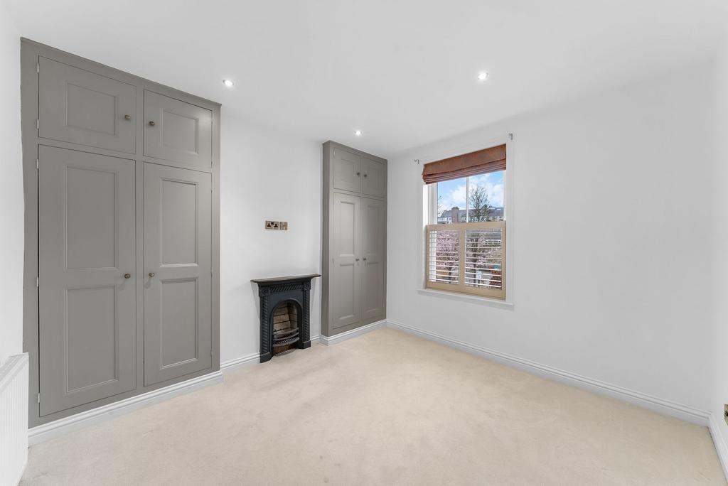 To the first floor are two generous double bedrooms, both enhanced by fitted storage and finished in a calm, neutral palette. These are served by a luxurious house bathroom, appointed with contemporary fittings including a bath with shower over, modern tiling and a heated towel rail.