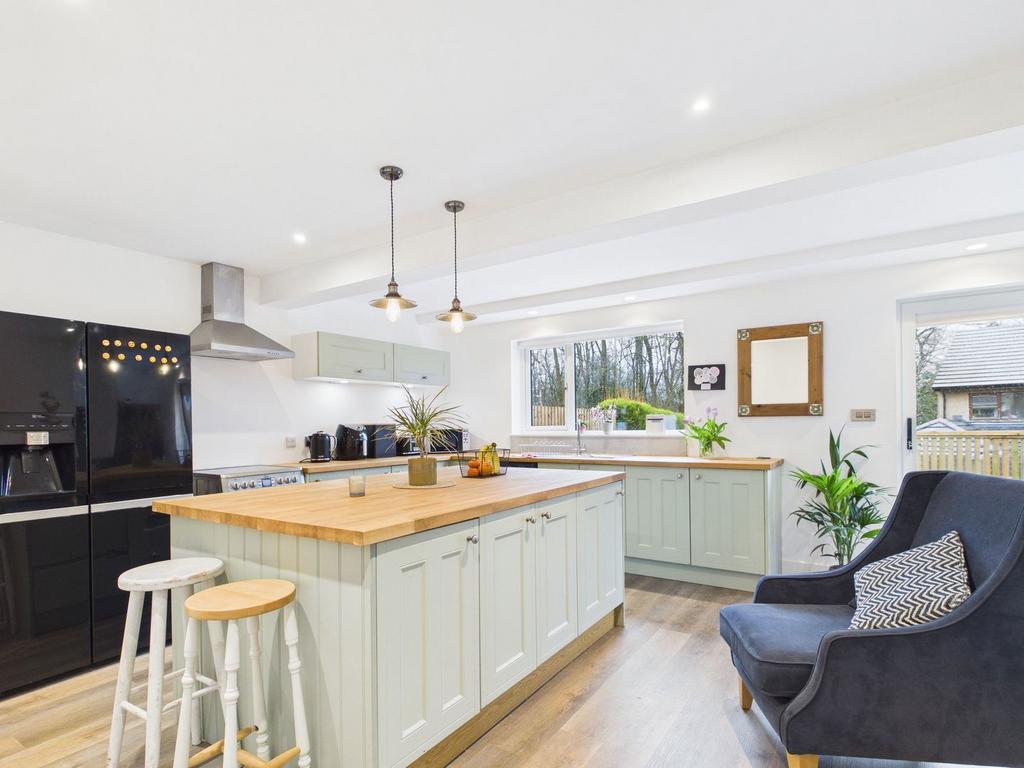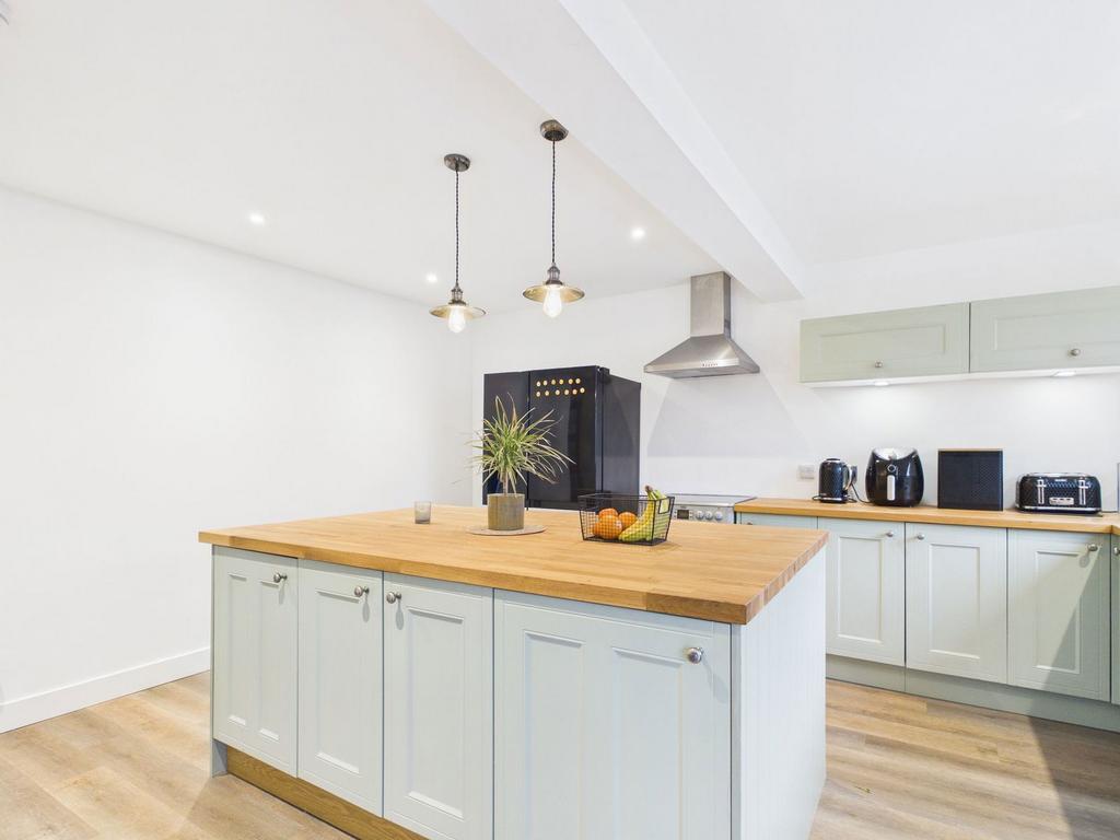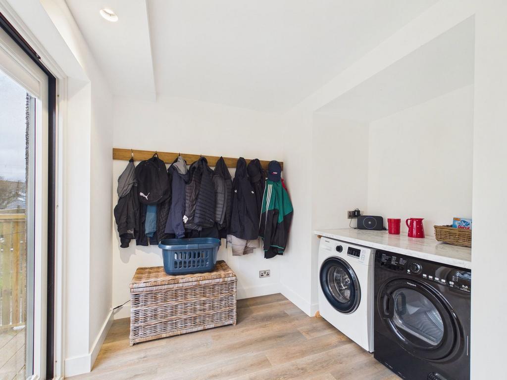 The kitchen offers a stylish range of modern wall and base units, complemented by a sleek kitchen island and wooden work tops. A stainless-steel sink unit and an integral dishwasher. A free-standing electric cooker, with stainless steel cooker hood and a space for a fridge/freezer. A modern utility area sits to the side of the kitchen, with space for washer/dryer and work top, with plenty of coat hanging space. Window overlooks the side of the property; the patio doors open onto the decking area and provide access to the garden.