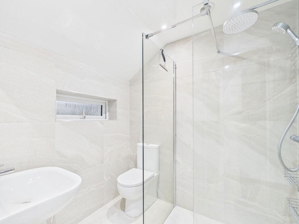 A beautifully finished and spacious bathroom featuring bath with overhead shower, with a glass shower screen, hand basin with storage underneath & WC, fully tiled walls and a heated towel rail. Shaving points and extractor fan for ventilation.