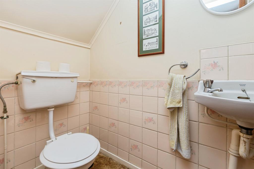 Window. WC. Wash hand basin. Half height tiled walls. Extractor fan.