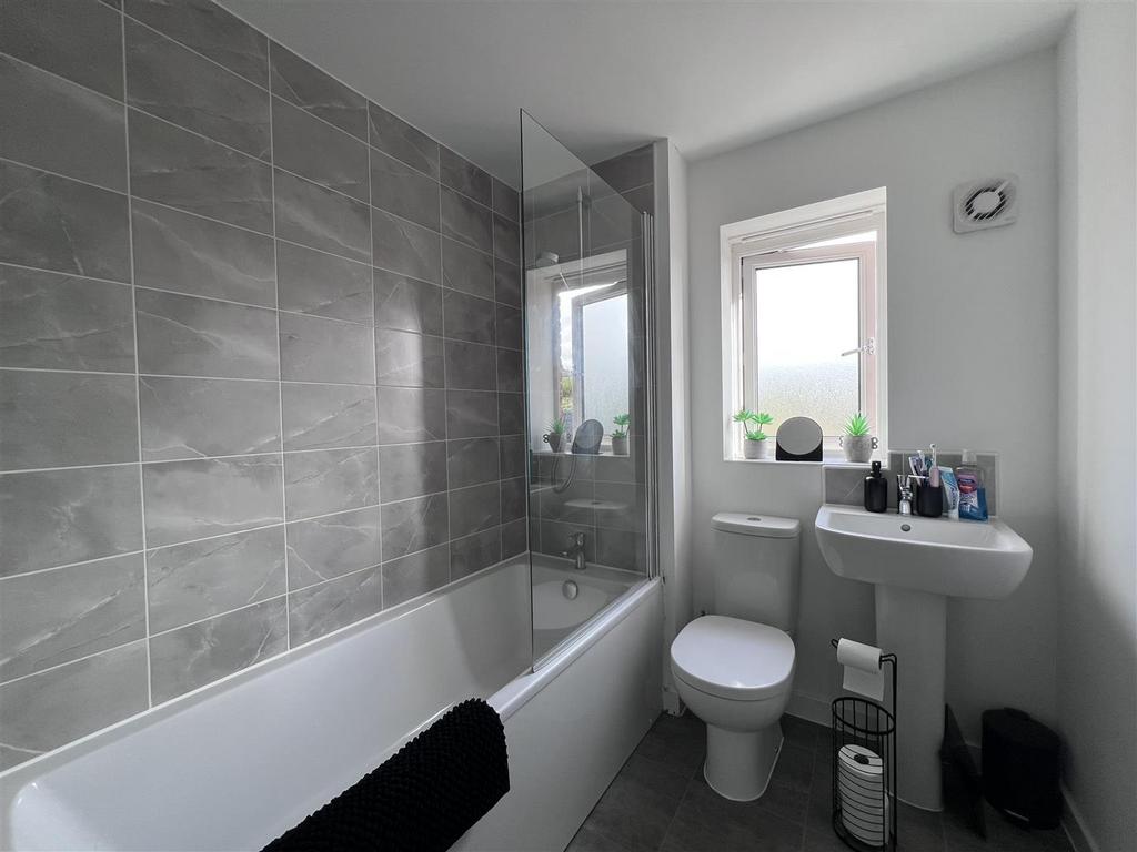 The bathroom has a three-piece suite in white comprising WC, wash basin and a bath with glass screen and shower over. Fully tiled walls and a window to the rear.