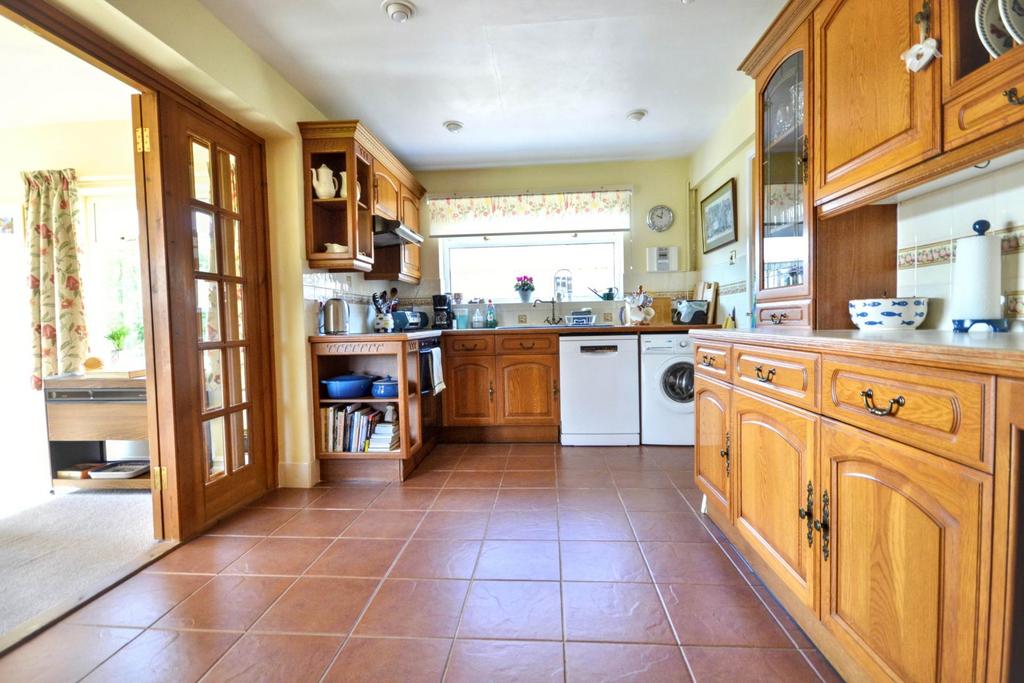 The kitchen enjoys a wealth of fitted units which sit alongside a host of integrated appliances. French doors to the head of the room lead through to the dining area, which is an extension added by the current vendors. This room is a lovely size and will comfortably house a six eight seater table and chairs and enjoys views over the garden and adjoining paddocks.