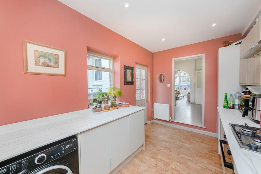 There is a bright entrance hall with ground floor W.C., generous front aspect sitting room opening into a sizeable dining room and includes a wonderful, dualaspect kitchen, with direct access to the rear garden. On the first floor is the bathroom, refitted with a modern white suite and two good size double bedrooms. There is also a converted loft room to make a light third bedroom.