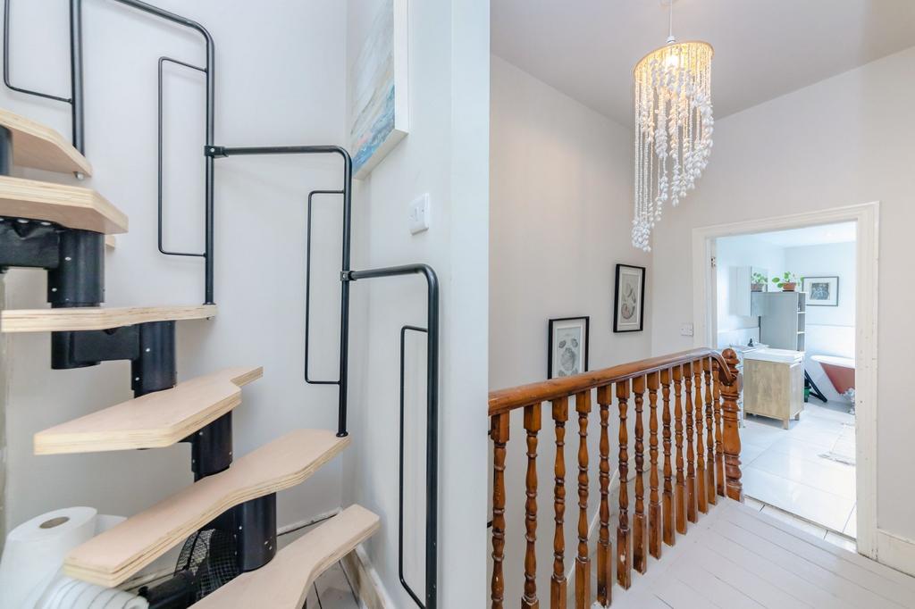 FIRST FLOOR LANDING- Stripped and painted floorboards with doors to principal rooms and stairs to second floor