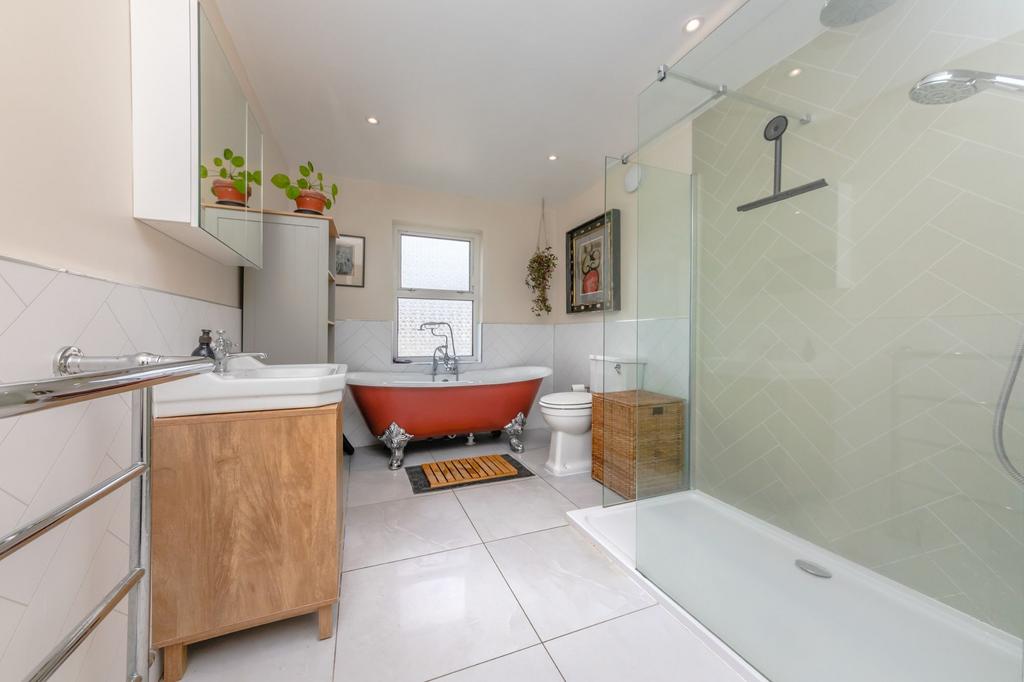 BATHROOM- A beautifully refitted modern suite comprising a stand-alone bath with shower head attachment, walk in shower with glass screen, wash hand basin with mixer tap, low-level wc and chrome heated towel rail. This suite further benefits from tiled flooring and herringbone style tiled walls and an obscured double-glazed window