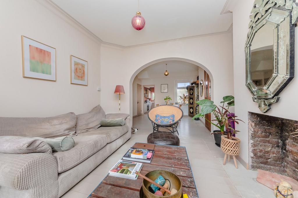 SITTING ROOM- A great front aspect space with an expansive double-glazed bay window, featuring a brick fireplace recess and stripped and painted floorboards. This opens into
