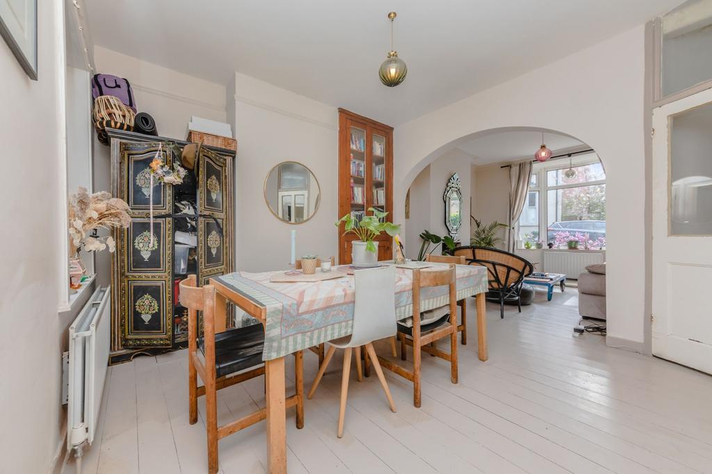 DINING ROOM- A beautifully bright room with stripped and painted floorboards, rear aspect double glazed windows overlooking the rear garden with space for a dining table, opening into the